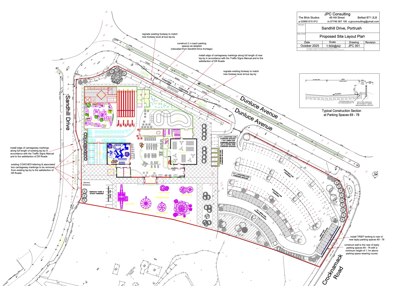 A revised layout for redevelopment plans at the former Dunluce Centre in Portrush has been uploaded to the planning portal, outlining a mix of outdoor rides and indoor family entertainment facilities.